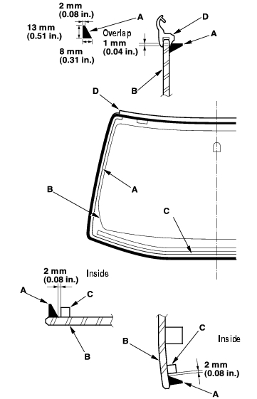 - Pack adhesive into the cartridge without air pockets to ensure continuous delivery. Put the cartridge in a caulking gun, and run a bead of adhesive (A) around the edge of the windshield (B) between the rubber dam (C) and molding (D) as shown. Apply the adhesive within 30 minutes after applying the glass primer. Make a slightly thicker bead at each corner.