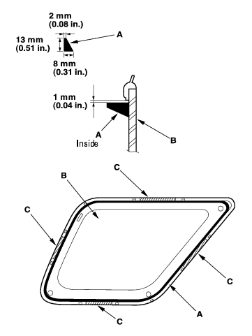 - With a sponge, apply a light coat of glass primer around the edge of the windshield (A) between the rubber dam (B) and molding (C) as shown, then lightly wipe it off with gauze or cheesecloth: