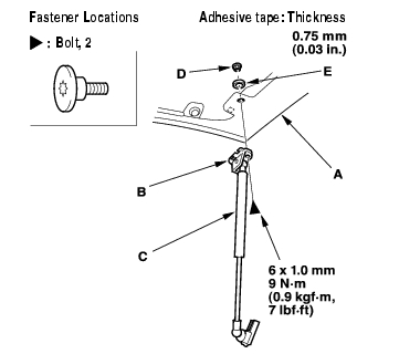- While holding the hatch glass (A), use a Torx T30 bit to remove the bolt, then release the double-faced adhesive tape (B), remove the hatch glass support strut (C), support strut nut (D), and seal (E) from the hatch glass.