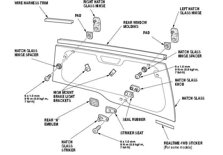 To remove the bolts, use a Torx T30 bit. To remove the rear window molding, refer to Rear Window Molding Replacement (see page 20-59) . To remove the high mount brake light bracket and wire harness trim, refer to High Mount Brake Light Bracket/Wire Harness Trim Replacement (see page 20-61) . Reassemble the hatch glass in the reverse order of removal. To install the rear ''H'' emblem and the REALTIME 4WD sticker, refer to Emblem/Sticker Replacement (see page 20-153) .