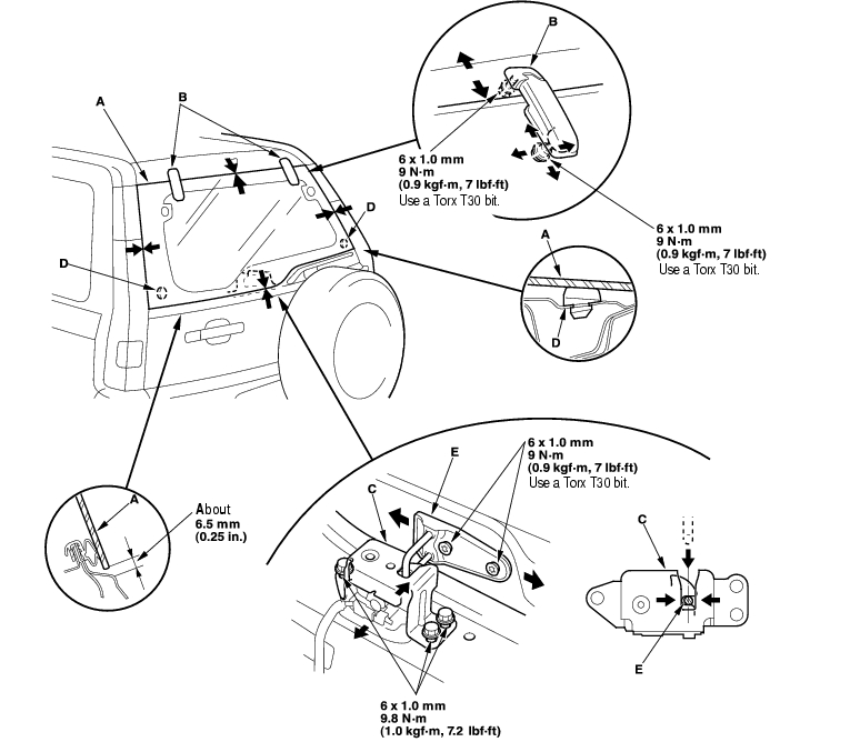- Adjust the hatch glass hinges (B) up and down, to obtain the proper gap between the hatch glass and tailgate.