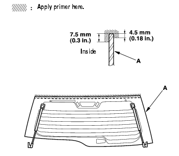 - Apply primer (YOKOHAMA RUBBER MS-90, or equivalent) to the upper edge of the hatch glass (A). Be careful not to touch the hatch glass where primer will be applied.
