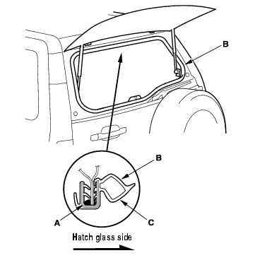 - Locate the painted alignment mark (C) on the hatch glass weatherstrip. Align the painted mark with the alignment tab in the center of the hatch glass opening, and install the weatherstrip. Make sure it's seated completely and facing in the direction shown. Make sure there are no wrinkles in the weatherstrip.
