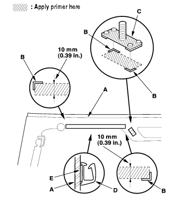 - Apply primer (YOKOHAMA RUBBER MS-90, or equivalent) to the inside face of the hatch glass (A):