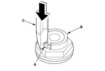 - Cut the lock tab (A) of the each shaft locknut (B) using a chisel (C). Then remove the locknuts and conical spring washers from each shaft.