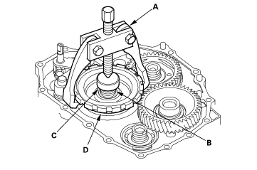 - Set a two-jaw (or three-jaw) puller (A) on the countershaft (B) with putting a collar (C) between the puller and countershaft, then remove the park gear (D).