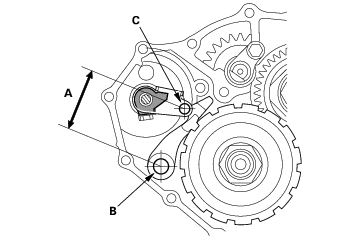 - Measure the distance (A) between the park pawl shaft (B) and the park lever roller pin (C).