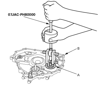 - Remove the idler gear shaft bearing (A) from the end cover (B) with the special tool.