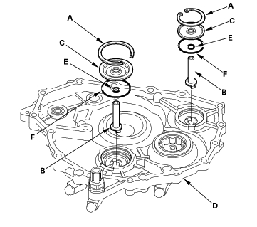 - Remove the snap rings (A), ATF feed pipes (B) and feed pipe flanges (C) from the end cover (D).