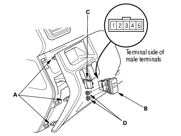 - Check for continuity between the terminals in each switch position according to the table. If there is no continuity, replace the illumination bulbs (D) or the switch.