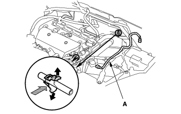 - Use a wrench on the fuel pulsation damper (A) at the fuel rail.