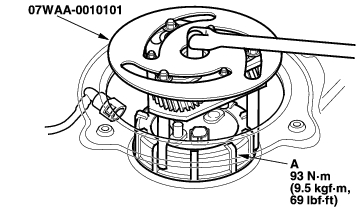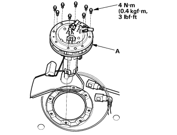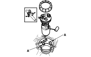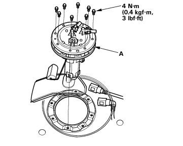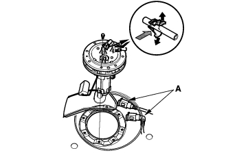Using the tool, loosen the locknut (A), and remove the fuel pump assembly from the fuel tank.
