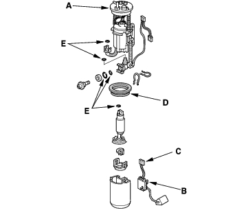 - Remove the strainer case (B), the fuel gauge sending unit (C), the case (D), the wire harness (E), and the fuel pressure regulator (F).