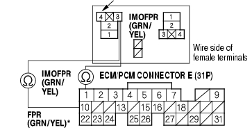 - Check for continuity between PGM-FI main relay 2 4P connector terminal No. 3 and ECM/PCM connector terminal E1 (E10)*.