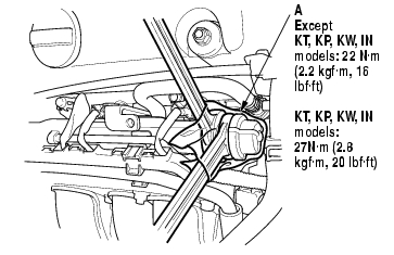 - Remove the pressure gauge, and reinstall the fuel pulsation damper with a new washer. Tighten the fuel pulsation damper to 22 N·m (2.2kgf·m, 16 lbf·ft) [KT, KP, KW, IN models: 27 N·m (2.8 kgf·m, 20 lbf·ft)].