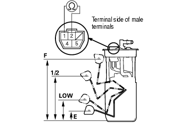 - Measure the resistance between the No. 1 and No. 2 terminals with the float at E (EMPTY), 1/2 (HALF FULL), and F (FULL) positions.