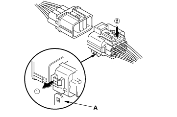 Make sure the connectors are clean and have no loose wire terminals. Make sure multiple cavity connectors are packed with grease (except watertight connectors). All connectors have push-down release type locks (A).
