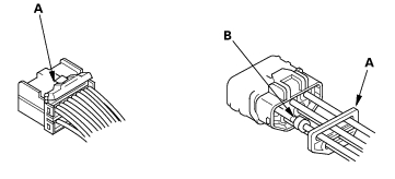 Some connectors have a clip on their side used to attach them to a mounting bracket on the body or on another component. This clip has a pull type lock. Some mounted connectors cannot be disconnected unless you first release the lock and remove the connector from its mount bracket (A).