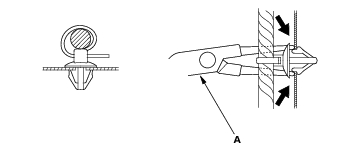 Slip pliers (A) under the clip base and through the hole at an angle, then squeeze the expansion tabs to release the clip.