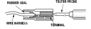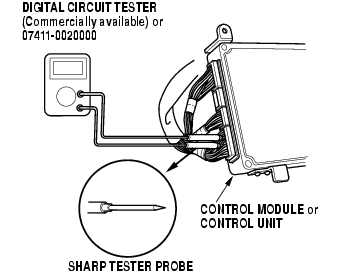 Refer to the instructions in the Honda Terminal Kit for identification and replacement of connector terminals. When checking any control module(s) or unit(s) connector terminals, gently slide the sharp tester probe from the wire side into the connector until it comes in contact with the terminal end of the wire.