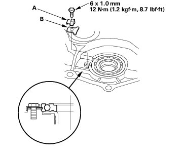 - Remove the bolt, then remove the lock washer (A) and bearing set plate (B).