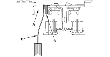 - Measure the clearance between the snap ring (A) and the 2nd clutch guide (B) with a feeler gauge (C), in at least three places. Use the average as the actual clearance.
