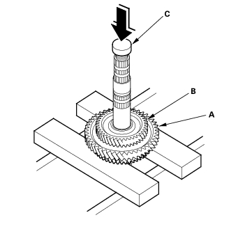 - Remove the 1st gear (A) and 3rd gear (B) from the countershaft with a press. Place a shaft protector (C) between the countershaft and press to prevent damaging the countershaft.