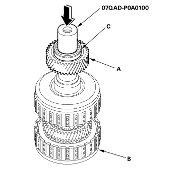 - Align the shaft splines with those on 1st gear, then press the countershaft (A) into the 1st gear (B) with a press. Place a shaft protector (C) between the countershaft and press to prevent damaging the contershaft.