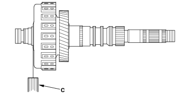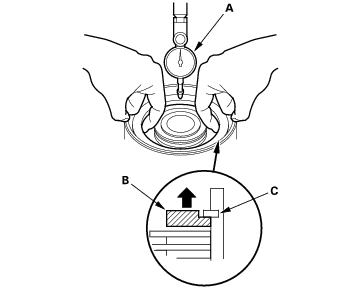 - Measure the clearance between the mainshaft flange (A) and 41 x 68 mm thrust washer (B) with a feeler gauge (C), in at least three places. Use the average as the actual clearance.