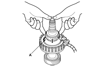 - Hold the secondary shaft, and measure the 1st gear axial clearance in at least three places while moving the 1st gear (A). Use the average as the actual clearance.