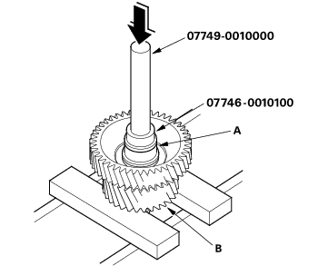 - Remove the idler gear shaft (A) from the idler gear (B) with the special tools and a press.