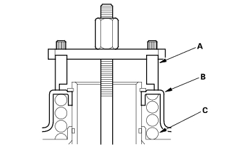 - Install the idler gear (A) on the secondary shaft (B), and install the ball bearing (C) over the idler gear with the special tool and a press.