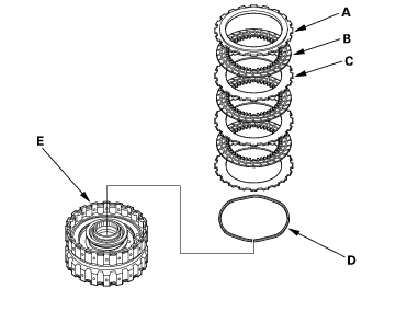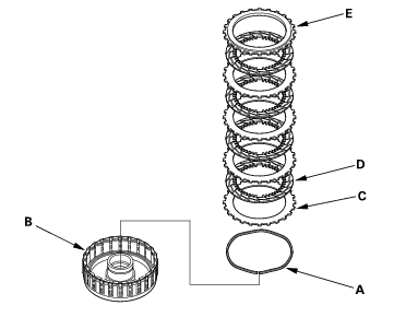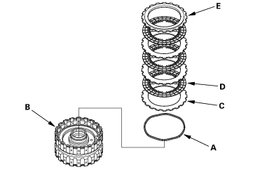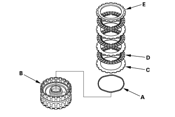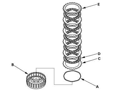 - Assemble the 4th clutch of K20A4 and K20A5 engine models: Install the waved spring (A) in the 4th clutch drum (B). Starting with the clutch waved-plate, alternately install the clutch plates (3) (C) and discs (3) (D), then install the clutch end plate (E) with the flat side toward the disc.