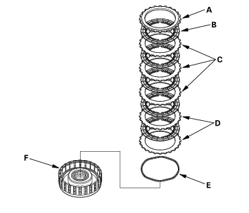 - Assemble the 2nd clutch of K20A4 and K20A5 engine models: Install the waved spring (A) in the 2nd clutch drum (B). Install the clutch flat-plate (C), then starting with the clutch disc, alternately install the clutch discs (4) (D) and waved-plates (3) (E), then install the clutch end plate (F) with the flat side toward the disc.