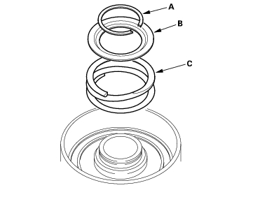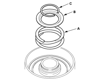 - Install the return spring (A) and spring retainer (B), and position the snap ring (C) on the retainer.