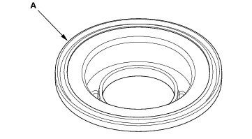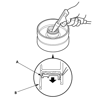 - Install the clutch piston (A) in the clutch drum (B). Apply pressure and rotate to ensure proper seating. Lubricate the piston O-ring with ATF before installing. Do not pinch the O-ring by installing the piston with to much force.