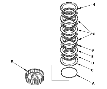 - Assemble the 2nd clutch of K24A1 engine model: Install the waved spring (A) in the 2nd clutch drum (B). Install the clutch flat-plate (C), clutch disc (D), and clutch flat-plate (E). Starting with the clutch disc, alternately install the clutch discs (4) (F) and clutch waved-pates (3) (G), then install the clutch end plate (H) with the flat side toward the disc.