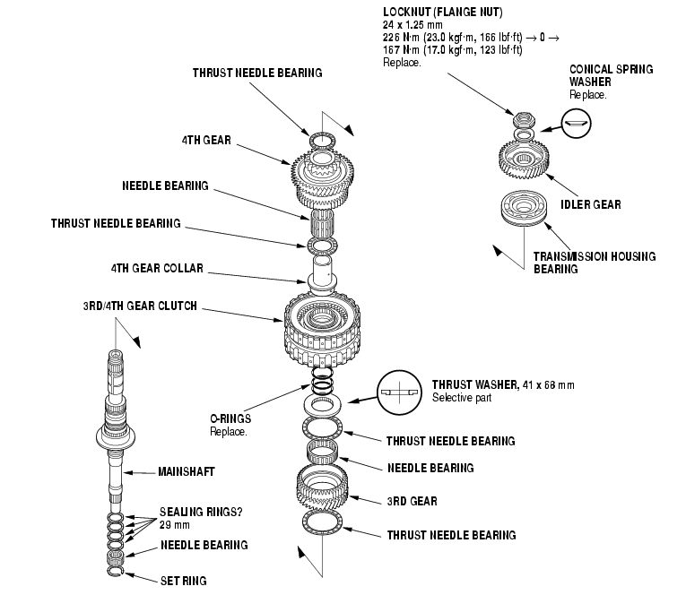 - Replace the locknut and conical spring washer with new ones when assembling the transmission.