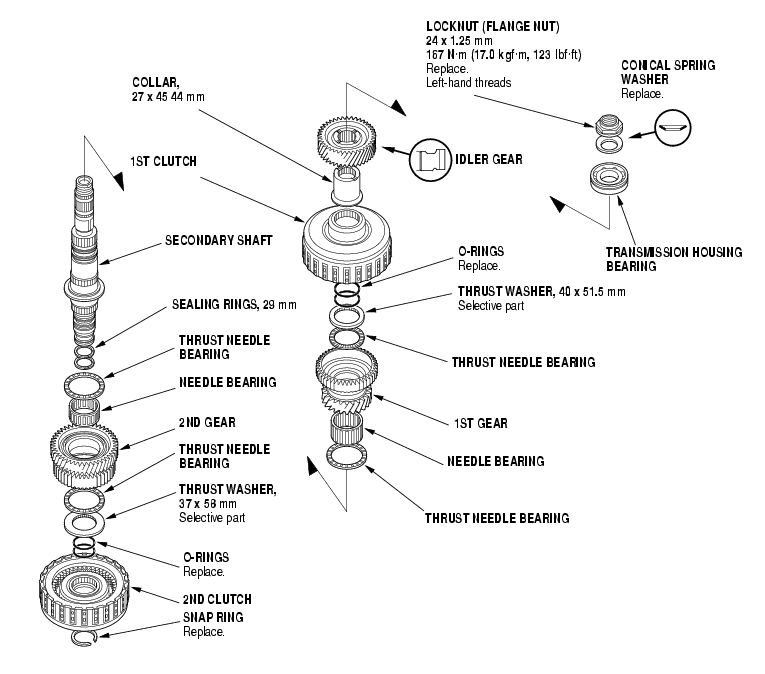 - Secondary shaft locknut has left-hand threads.