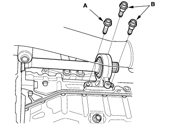 - Remove the flange bolt (A) and two dowel bolts (B).