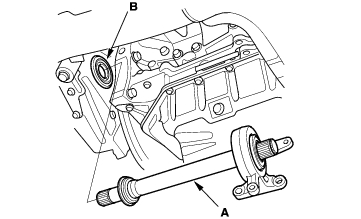 - Remove the intermediate shaft (A) from the differential. Hold the intermediate shaft horizontal until it is clear of the differential to prevent damage to the differential oil seal (B).