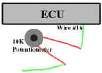 Solder up some wire leads to a 10k potentiometer using the first 2 terminals so that when the dial is turned as far as it can go clockwise you have 0 ohms resistance. Cut wire 16 and solder the potentiometer in series. It doesn't matter which side of the potentiometer goes to which wire. You should start tuning the car with the knob turned fully clockwise (the ecu will see the real elevation). By turning the knob counterclockwise the ecu will think that the car is at a higher elevation and will reduce fuel to accommodate less oxygen. Do not try and tune without monitoring the O2 sensor with a voltmeter. Tune until you get .88-.92 at wide open throttle. You will only be able to adjust full throttle A/F ratio with this mod. It won't do anything for the lower rpms. All cars can benefit from this since Mitsubishi programmed the ecu so that it runs rich at full throttle. Don't try and do this unless you understand the fuel system in the car. If you lean it out too much you can cause detonation that can destroy your engine.