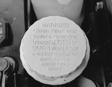 When adding fluid to the brake master cylinder, use a quality brake fluid of the DOT 3 or DOT 4 specifications. Never reuse old brake fluid.