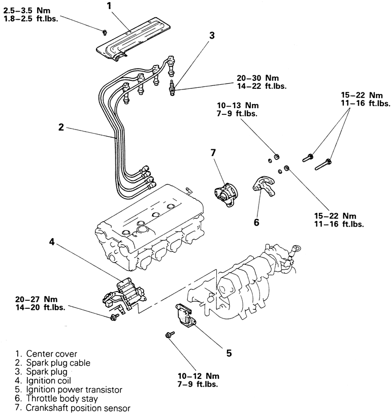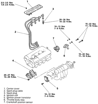 The ignition system found on the 2.0L and 2.4L engines is a distributorless type. The advance of this system, like the distributor type ignition system on the 1.8L engine, is controlled by the Engine Control Unit (ECU) or Powertrain Control Module (PCM). The distributorless ignition system contains a crank angle/position sensor which detects the crank angle or position to each cylinder and converts this data into pulse signals. These signals are sent to the ECU/PCM, which will calculate the engine rpm and regulate the fuel injection and ignition timing accordingly. The system also contains a top dead center sensor which detects the top dead center position of each cylinder and converts this data into pulse signals. These signals are then sent to the ECU/PCM, which will calculate the sequence of fuel injection and engine rpm. Both sensors are located in a common housing on the cylinder head opposite the timing belt side. The power and ground for both sensors is supplied by the ECU/PCM.
