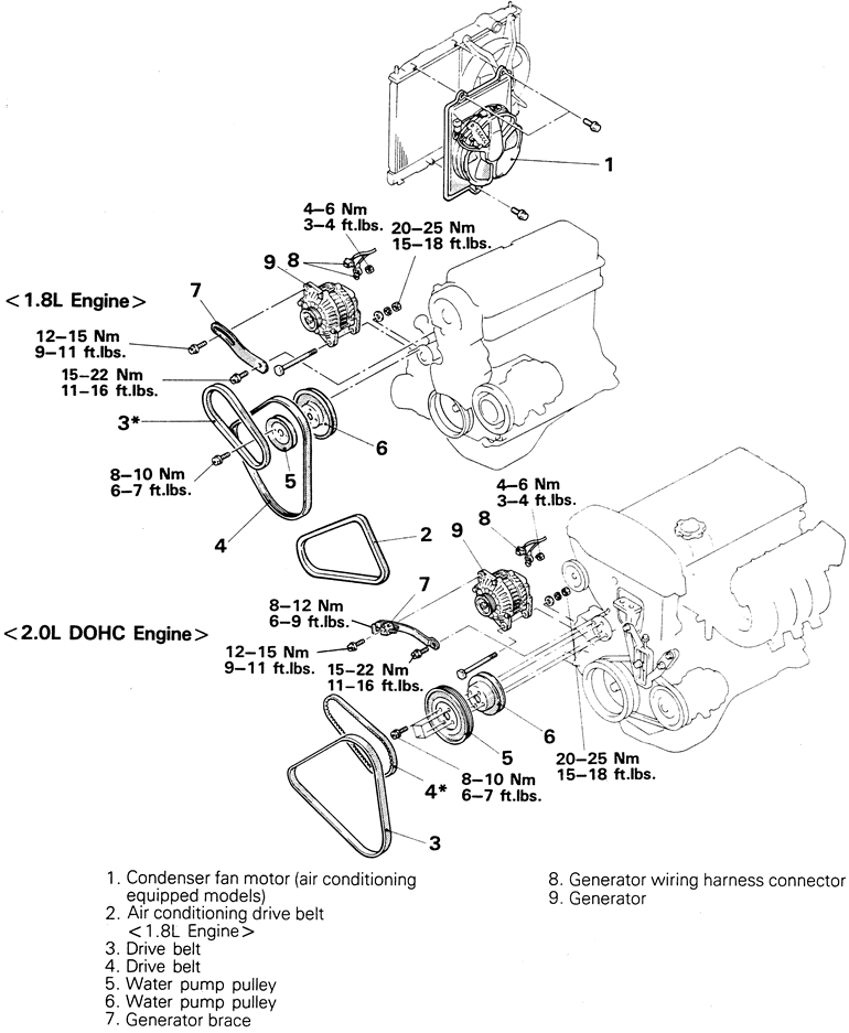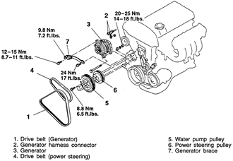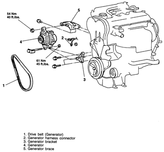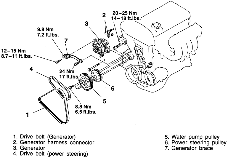 | Fig. 2: Exploded view of the alternator mounting — 1995–98 2.0L non-turbo engine |