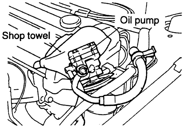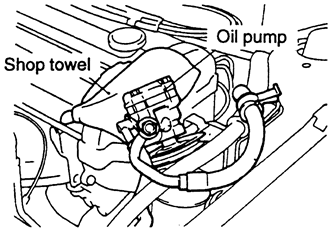 | Fig. 9: Position the power steering pump aside with a rag underneath |