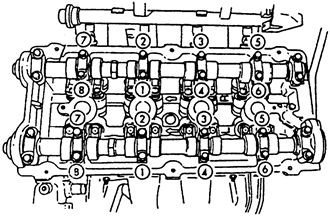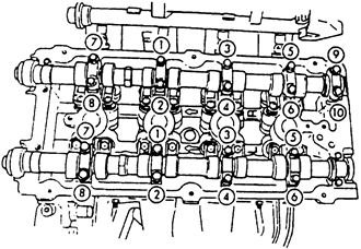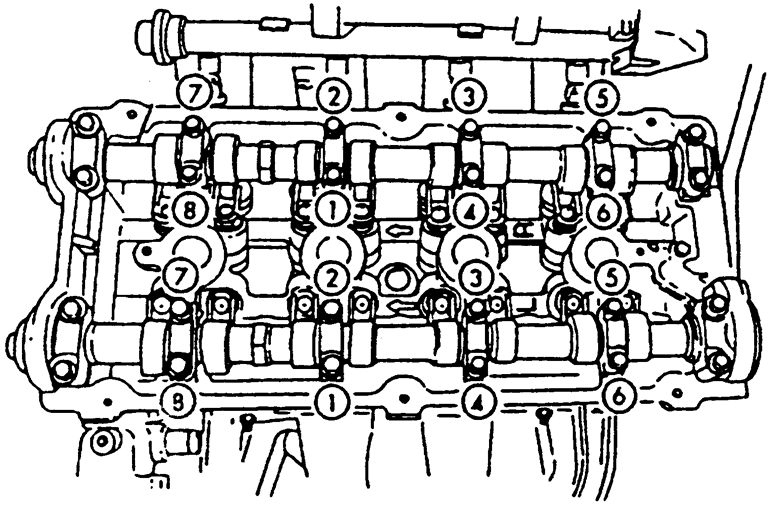 | Fig. 3: Camshaft bearing cap bolt removal sequence — 1995–98 2.0L non-turbo engine |