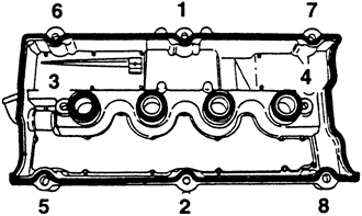 | Fig. 6: Cylinder head cover bolt installation sequence — 1995–98 non-turbo engine |