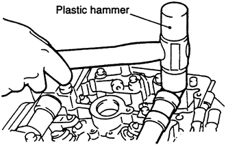 | Fig. 7: Tap the camshaft with a plastic hammer to loosen the bearing caps — 1995–98 2.0L turbo engine |