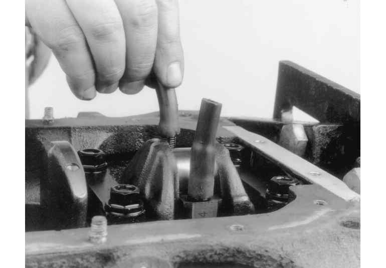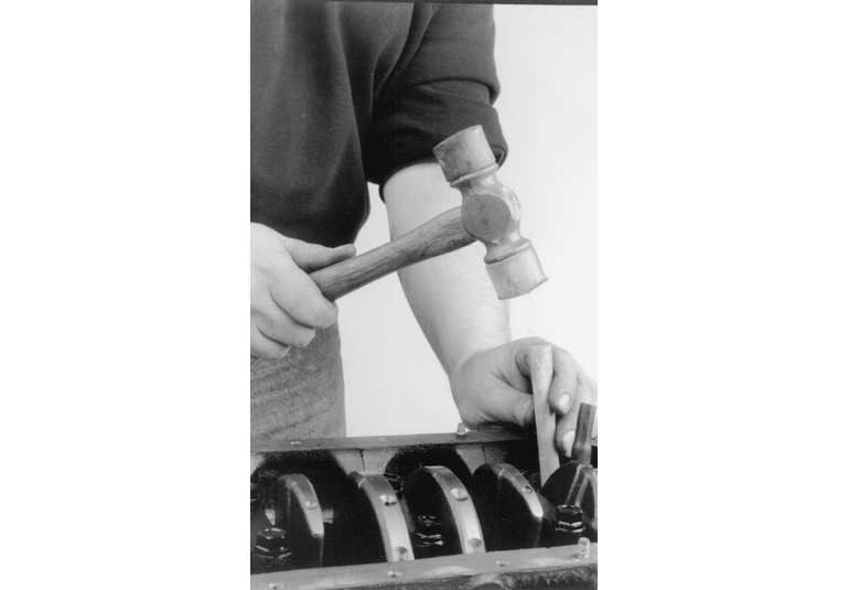 Again, rotate the engine, this time to position the number one cylinder bore (head surface) up. Turn the crankshaft until the number one piston is at the bottom of its travel, this should allow the maximum access to its connecting rod. Remove the number one connecting rods fasteners and cap and place two lengths of rubber hose over the rod bolts/studs to protect the crankshaft from damage. Using a sturdy wooden dowel and a hammer, push the connecting rod up about 1 in. (25mm) from the crankshaft and remove the upper bearing insert. Continue pushing or tapping the connecting rod up until the piston rings are out of the cylinder bore. Remove the piston and rod by hand, put the upper half of the bearing insert back into the rod, install the cap with its bearing insert installed, and hand-tigthen the cap fasteners. If the parts are kept in order in this manner, they will not get lost and you will be able to tell which bearings came form what cylinder if any problems are discovered and diagnosis is necessary. Remove all the other piston assemblies in the same manner. On V-style engines, remove all of the pistons from one bank, then reposition the engine with the other cylinder bank head surface up, and remove that banks piston assemblies.